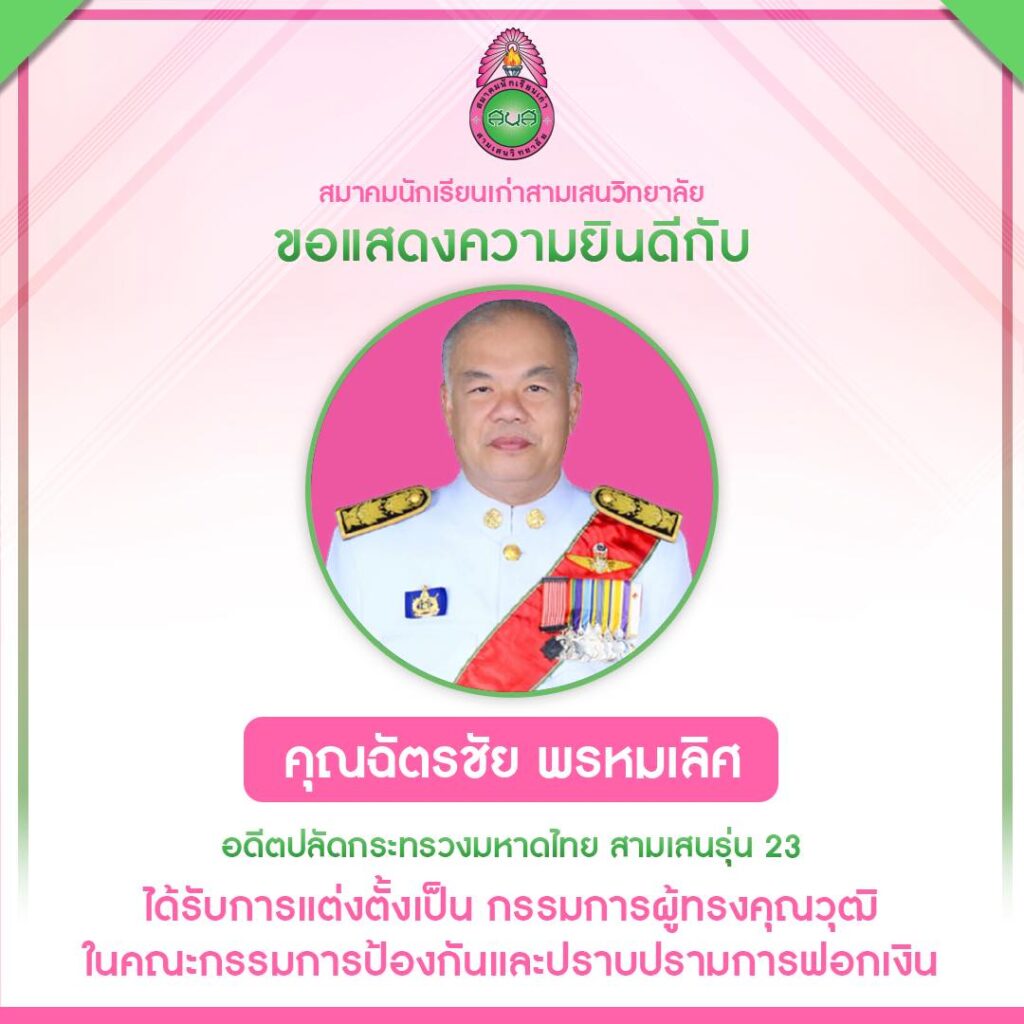 สมาคมนักเรียนเก่าสามเสนวิทยาลัย ขอแสดงความยินดีกับ คุณฉัตรชัย พรหมเลิศ สามเสนวิทยาลัยรุ่นที่ 23 ในโอกาสได้รับการแต่งตั้งให้ดำรงตำแหน่ง กรรมการผู้ทรงคุณวุฒิในคณะกรรมการป้องกันและปราบปรามการฟอกเงิน