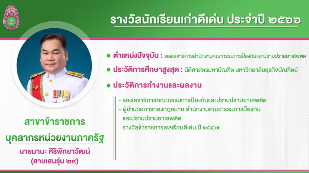 นายมานะ ศิริพิทยาวัฒน์ (รุ่นที่ ๒๙) รองเลขาธิการ สำนักงานคณะกรรมการป้องกันและปราบปรามยาเสพติด