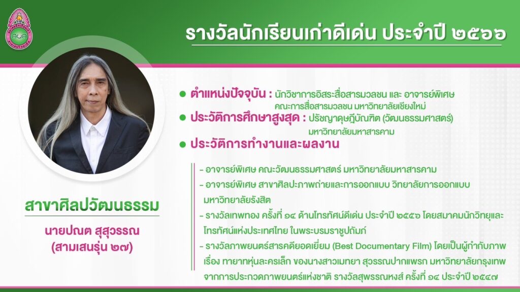 นายปณต สุสุวรรณ (รุ่น ๒๗) นักวิชาการอิสระสื่อสารมวลชน และอาจารย์พิเศษ คณะการสื่อสารมวลชน มหาวิทยาลัยเชียงใหม่