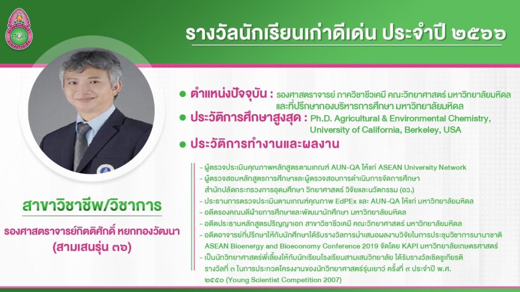 ๒. รองศาตราจารย์กิตติศักดิ์ หยกทองวัฒนา (รุ่น ๓๖) รองศาสตราจารย์ภาควิชาเคมี คณะวิทยาศาสตร์ มหาวิทยาลัยมหิดล และที่ปรึกษากองบริหารการศึกษามหาวิทยาลัยมหิดล