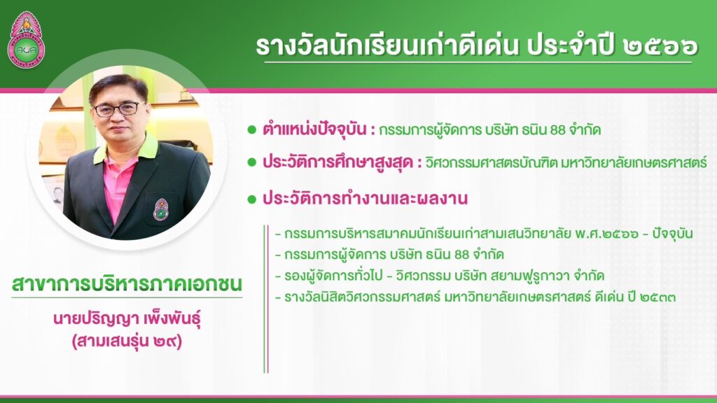 นายปริญญา เพ็งพันธุ์ (รุ่น ๒๙) กรรมการผู้จัดการ บริษัท ธนิน 88 จำกัด