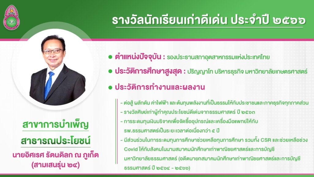 ๑. นายอิศเรศ รัตนดิลก ณ ภูเก็ต (รุ่น ๒๔) รองประธานสภาอุตสาหกรรมแห่งประเทศไทย สภาอุตสาหกรรมแห่งประเทศไทย