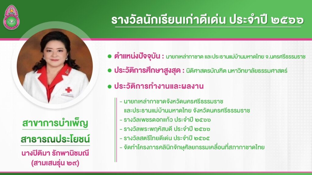 ๒. นางปิติมา รักพานิชมณี (รุ่น ๒๙) นายกเหล่ากาชาดจังหวัดนครศรีธรรมราช และประธานแม่บ้านมหาดไทย จังหวัดนครศรีธรรมราช