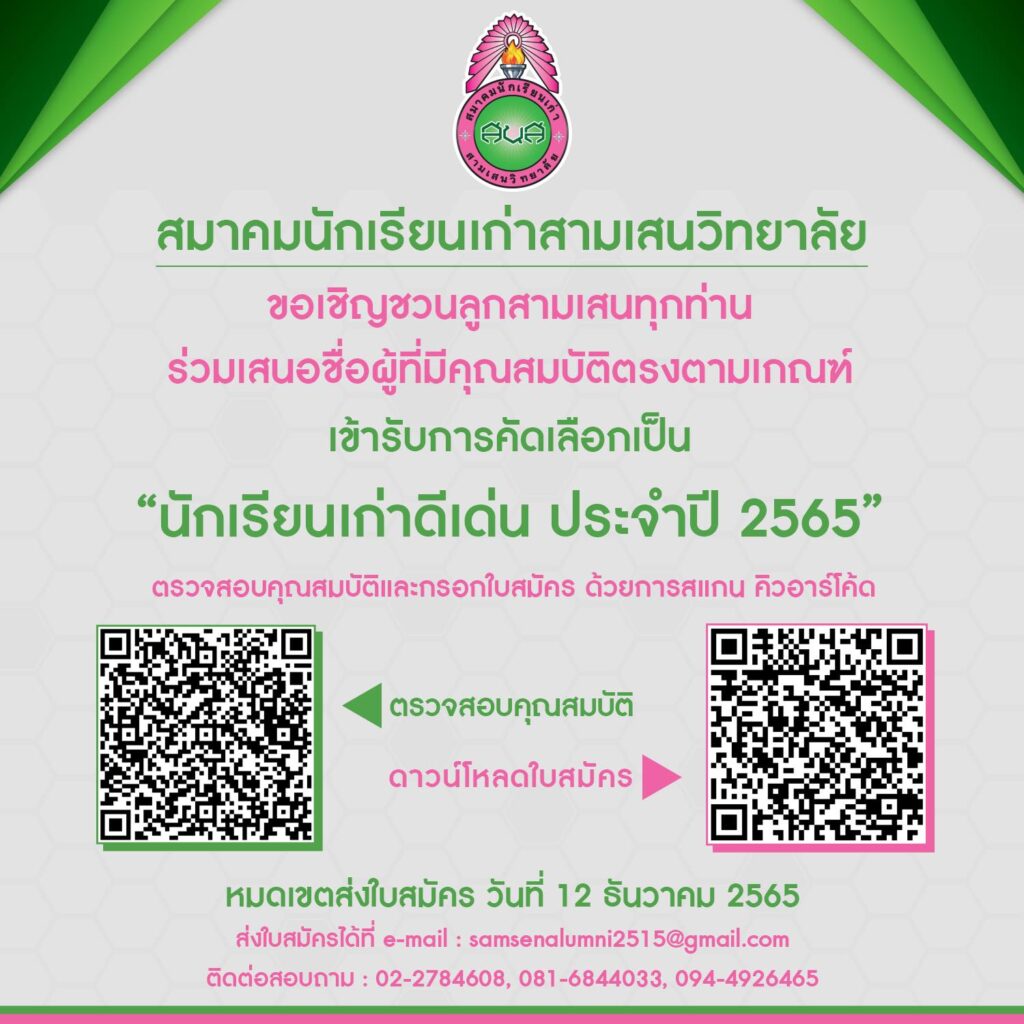 สมาคมนักเรียนเก่าสามเสนวิทยาลัยขยายระยะเวลาเชิญชวนเสนอชื่อผู้ที่มีคุณสมบัติตรงตามเกณฑ์ เข้ารับการคัดเลือกเป็น “นักเรียนเก่าดีเด่น ประจำปี 2565” ถึงวันที่ 23 ธันวาคม 2565เข้าไปดูคุณสมบัติและกรอกใบสมัครได้ในคิวอาร์โค้ดด้านล่างค่ะส่งใบสมัครได้ที่ e-mail : samsenalumni2515@gmail.comติดต่อสอบถาม : สมาคมฯ 02-2784608คุณเบิร์ด 094-4926465คุณวอ 081-684-4033Download เอกสารใบเสนอชื่อPDFใบเสนอชื่อ-นร.เก่าดีเด่น-2565.pdfms wordใบเสนอชื่อ-นร.เก่าดีเด่นสามเสนวิทยาลัย.docx